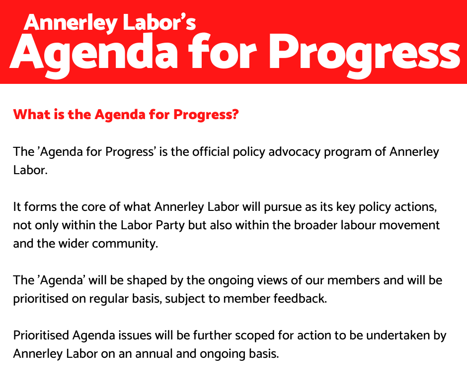 The Agenda for Progress, as revised by Annerley Labor in May 2023, is as follows:
